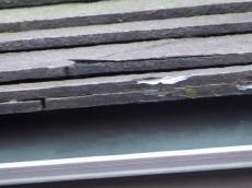 | 屋根全体的に瓦の塗膜剥れや退色があります。 | 瓦小口より層間剥離が発生し始めていてます。瓦表面が浮いていて、順々に剥離が進行するとミルフィーユ状態になります。 | 瓦の小口は塗膜が剥れているため水を吸収し易くなっています。防水機能が低下している状態です。 |
