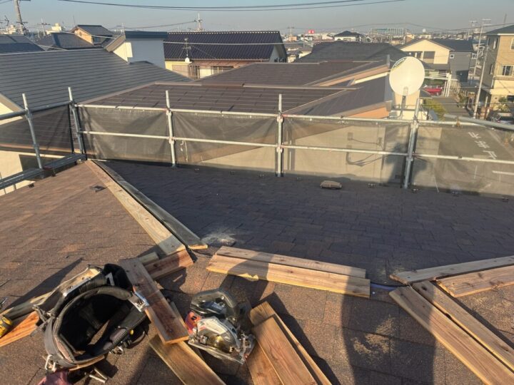 隅棟に下地材を取り付けて、棟板金を取り付けます。屋根カバー工事