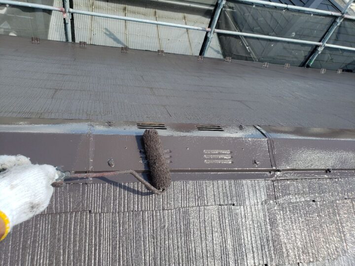 スレート瓦・棟板金 上塗り1回目屋根塗装