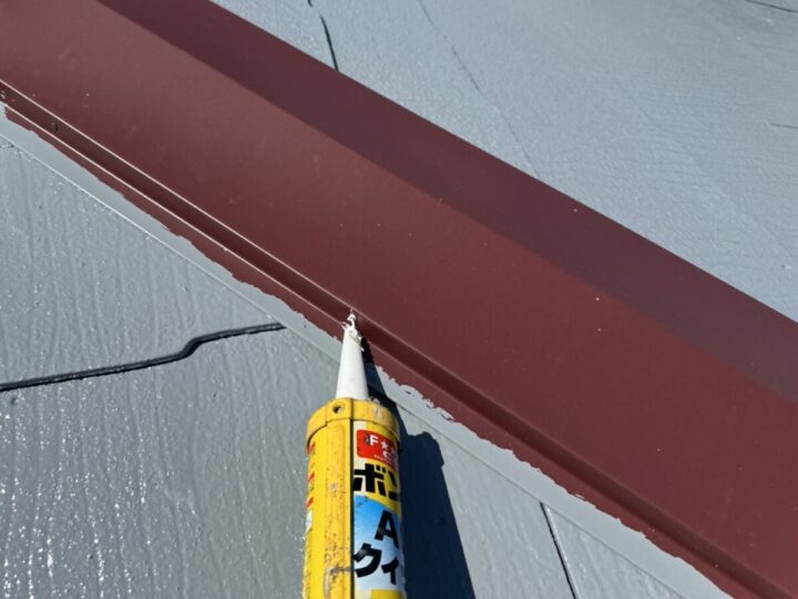 棟板金の継手と接合部にシーリングを施します。屋根塗装