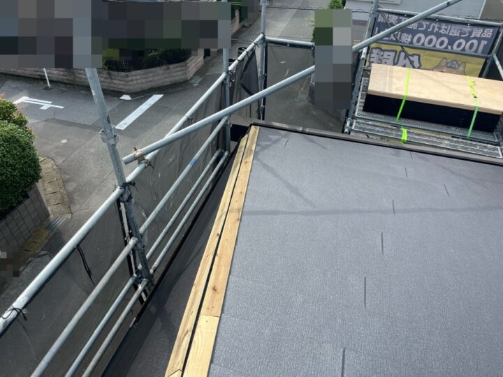 軒先板金などの役物を取り付けて、アスファルトルーフィング(防水紙)を棟まで張り終えます。屋根カバー工事