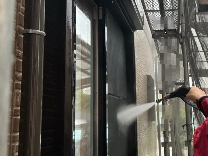 劣化した塗膜や苔、埃や汚れを高圧の水で洗浄します。高圧洗浄