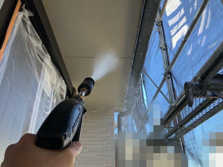 埃や汚れを高圧の水で洗浄して塗料の密着を高めます。高圧洗浄
