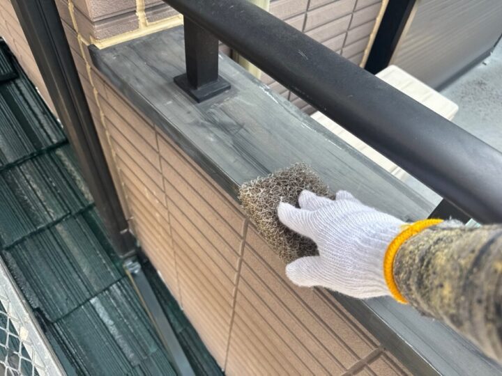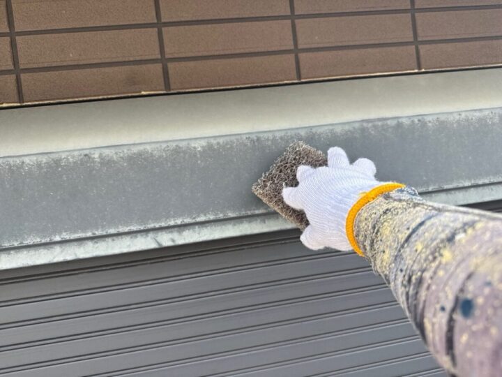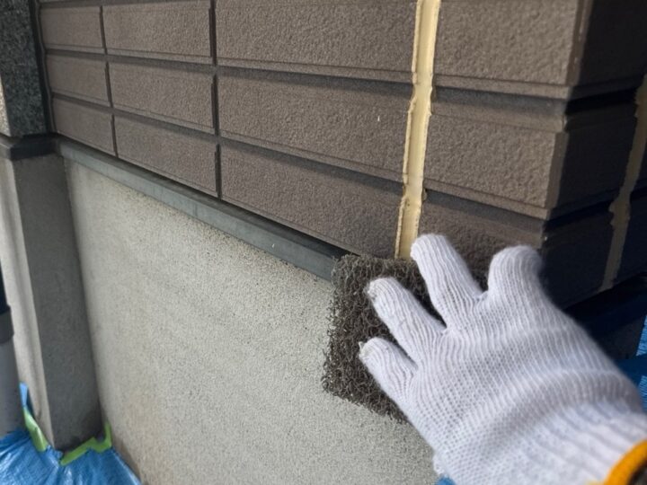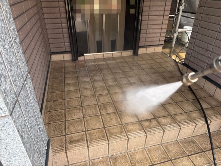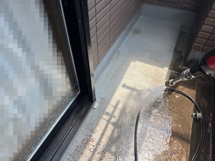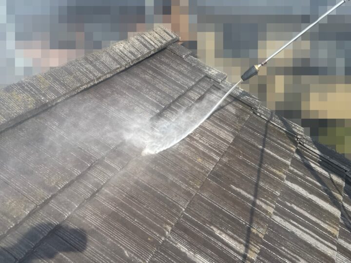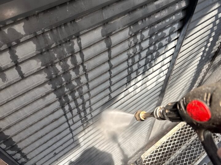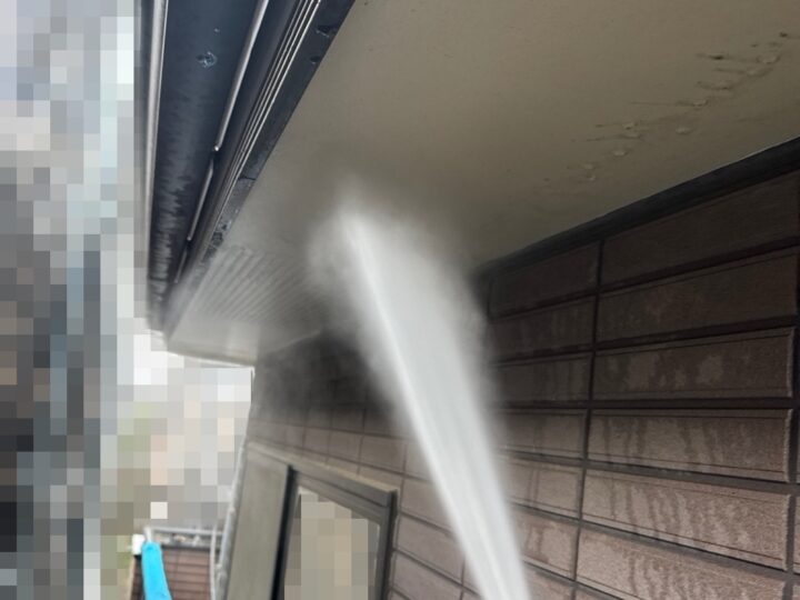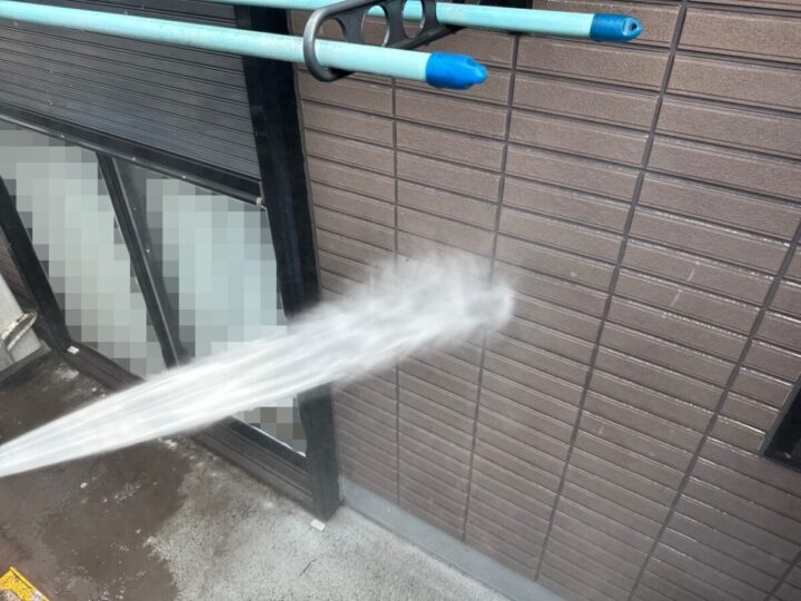 埃や汚れを高圧の水で洗浄して塗料の密着を高めます。高圧洗浄