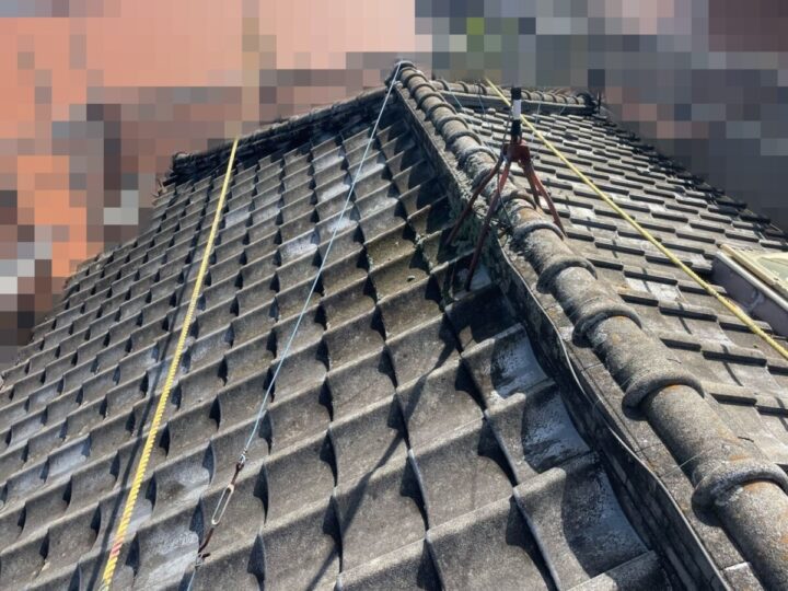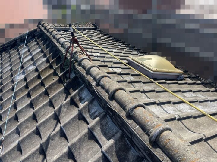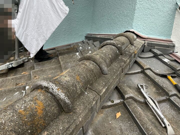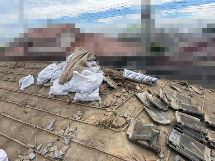 既存の陶器瓦を撤去します。屋根葺き替え工事