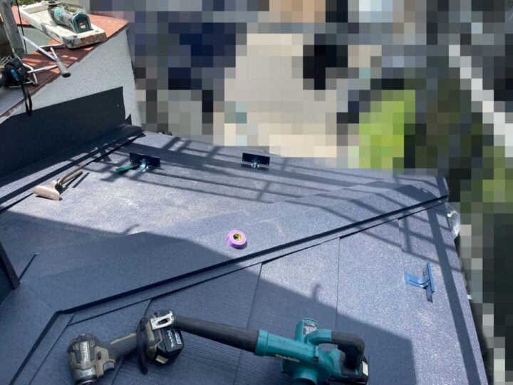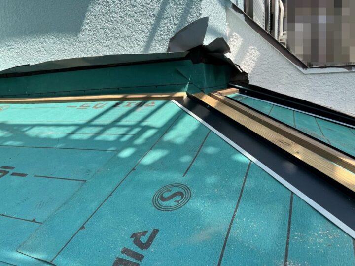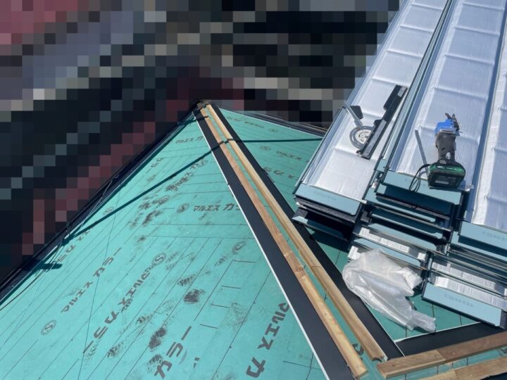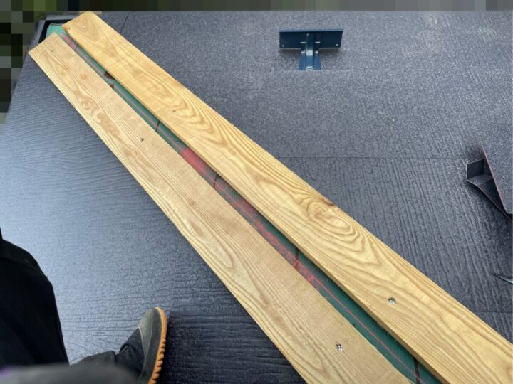 屋根材本体の受木を接合部に取り付けます。屋根葺き替え工事