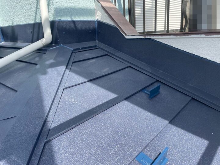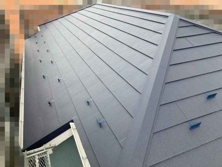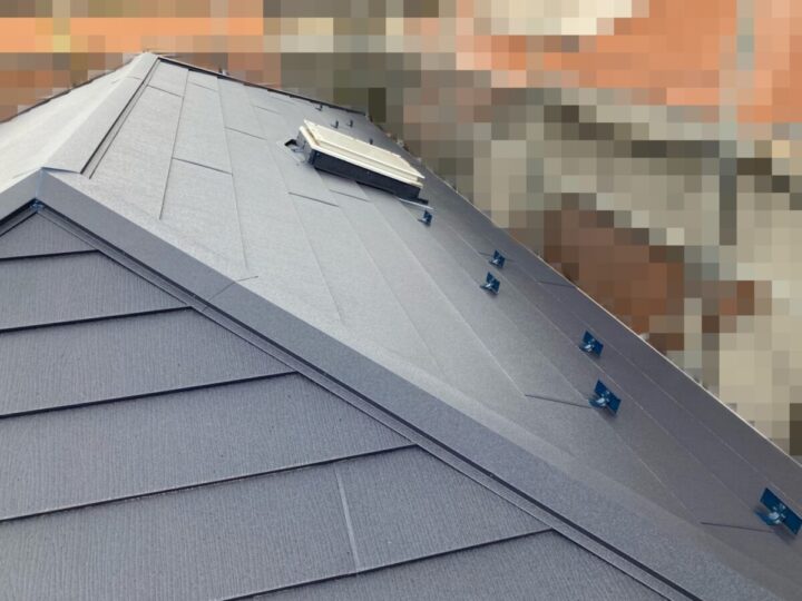 棟板金の継手と接合部にシーリングを施して仕上げます。屋根葺き替え工事