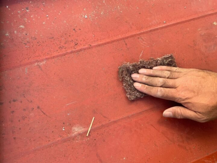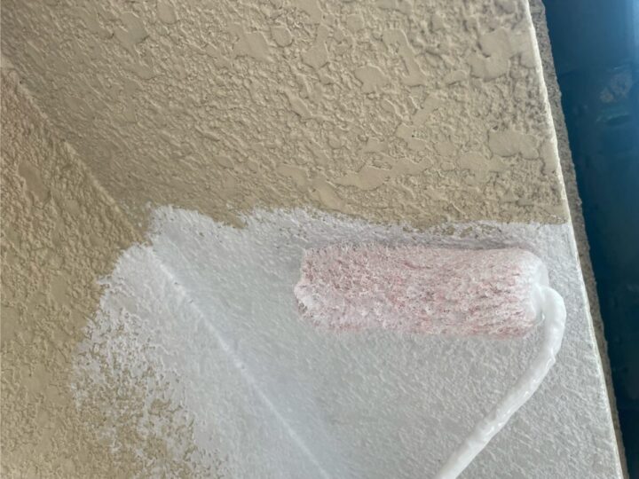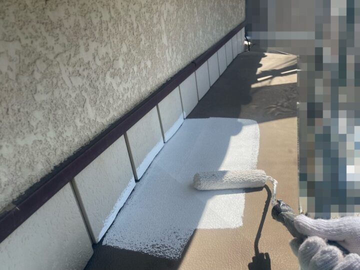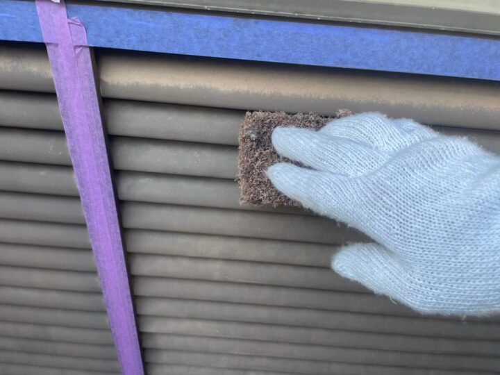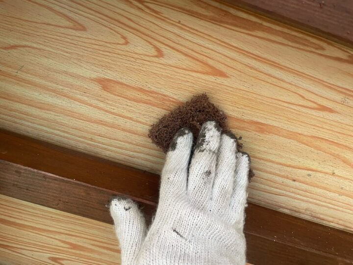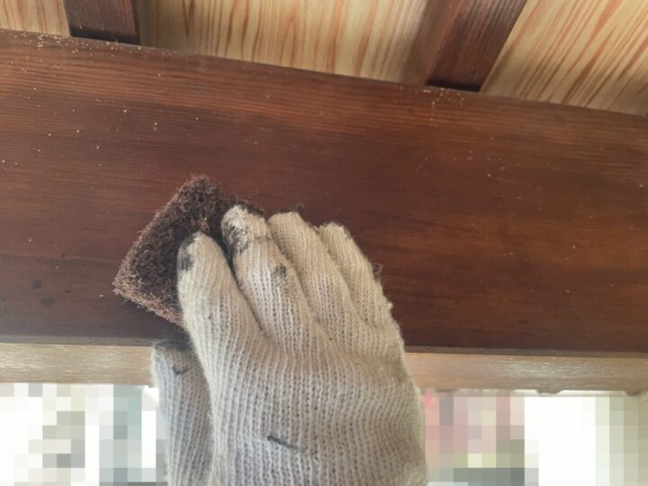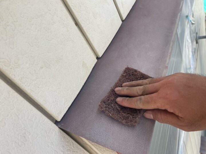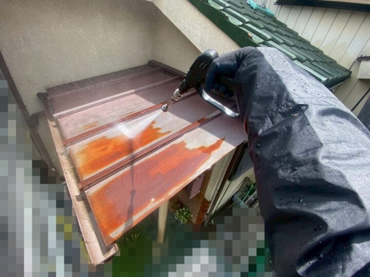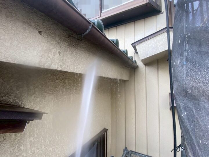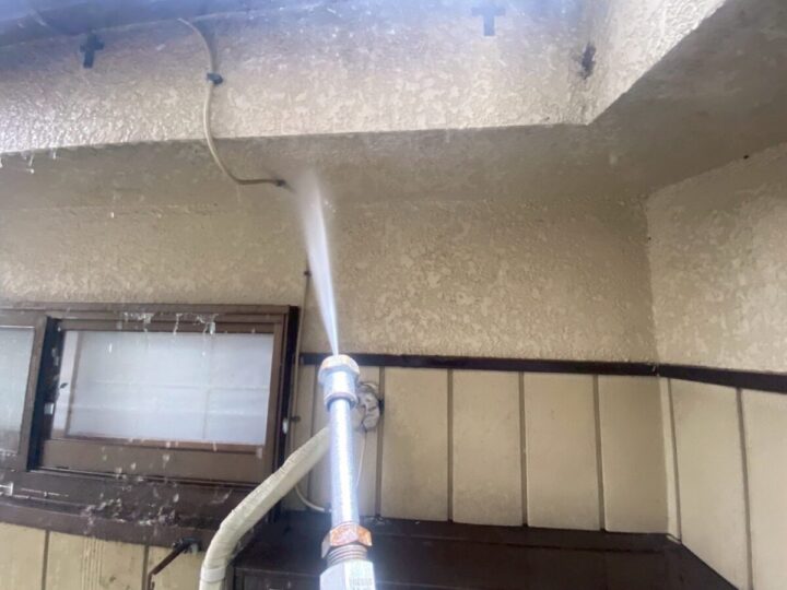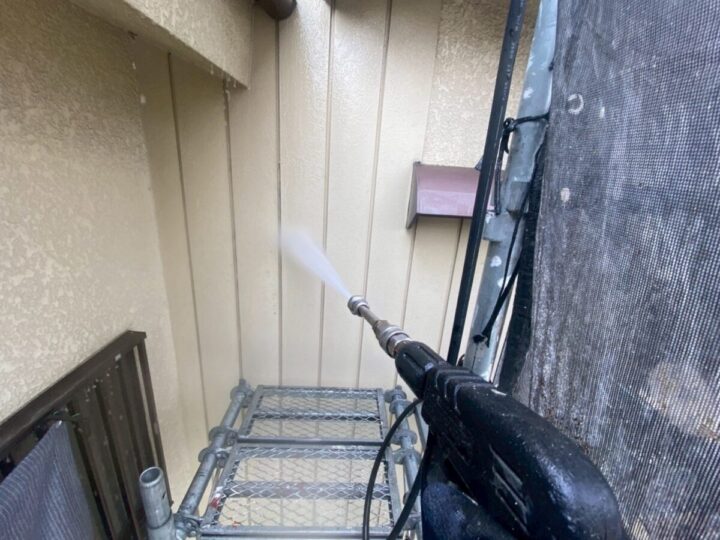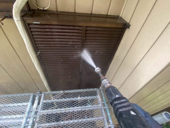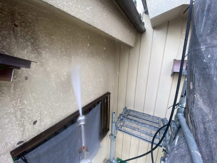 埃や汚れを高圧の水で洗浄して塗料の密着を高めます。高圧洗浄
