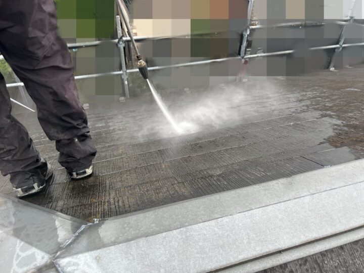 屋根カバー施工のため埃、苔を高圧の水で洗浄します。高圧洗浄