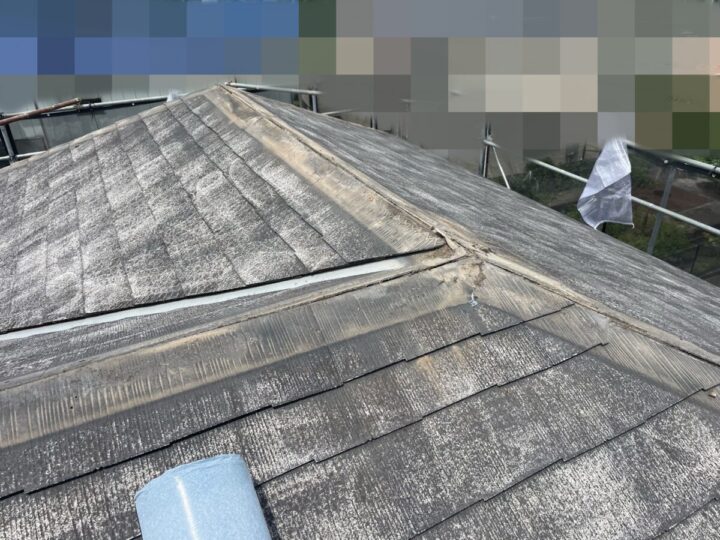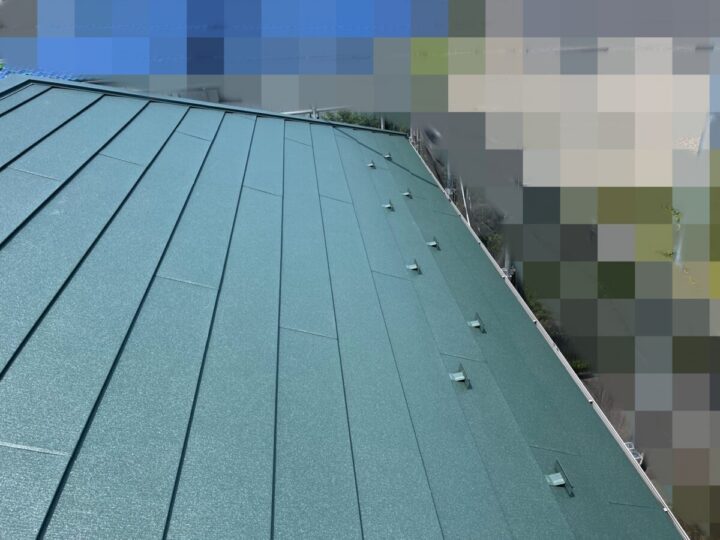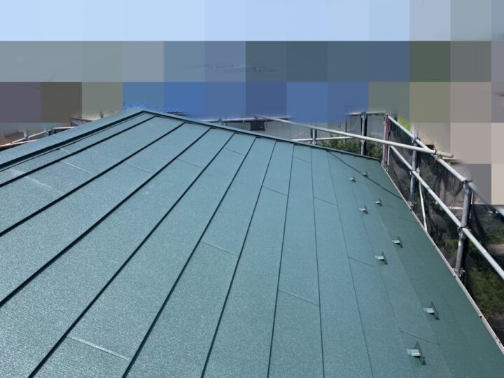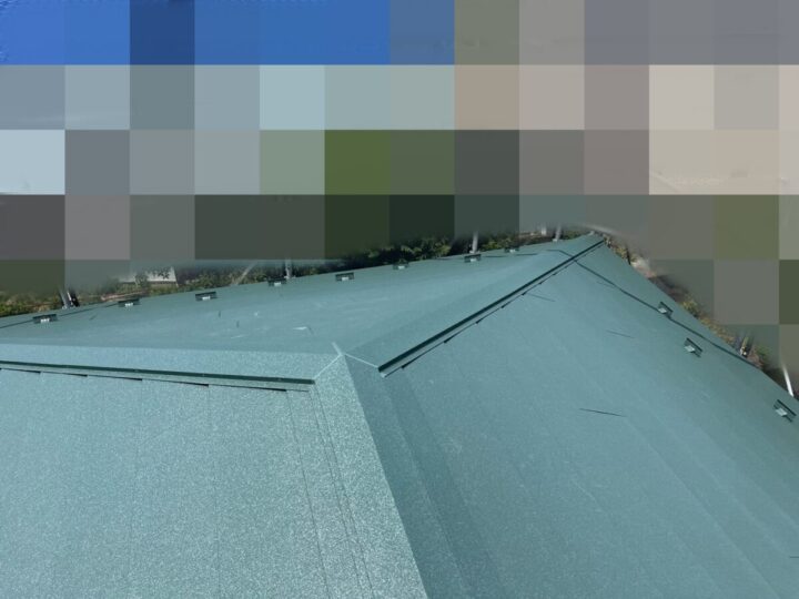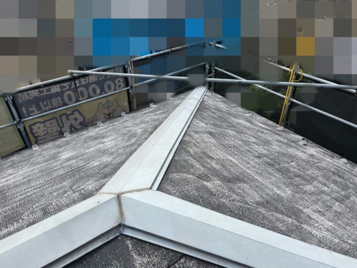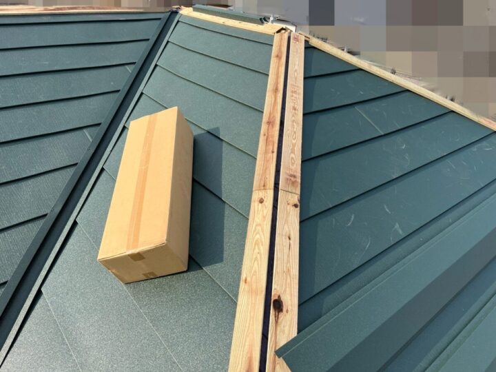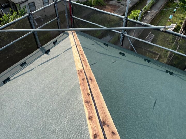 屋根材本体を棟まで張り終え屋根材接合部に棟の下地